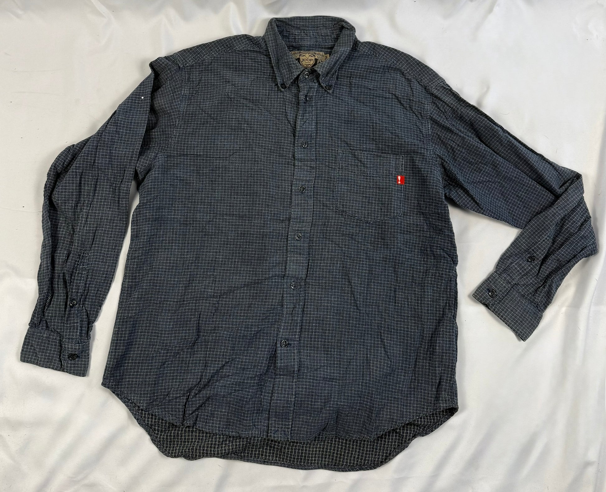 Blouse van het merk Joop in een blauwgrijze kleur met blokjespatroon. De blouse is een herenmaat M en gemaakt van 100% katoen.