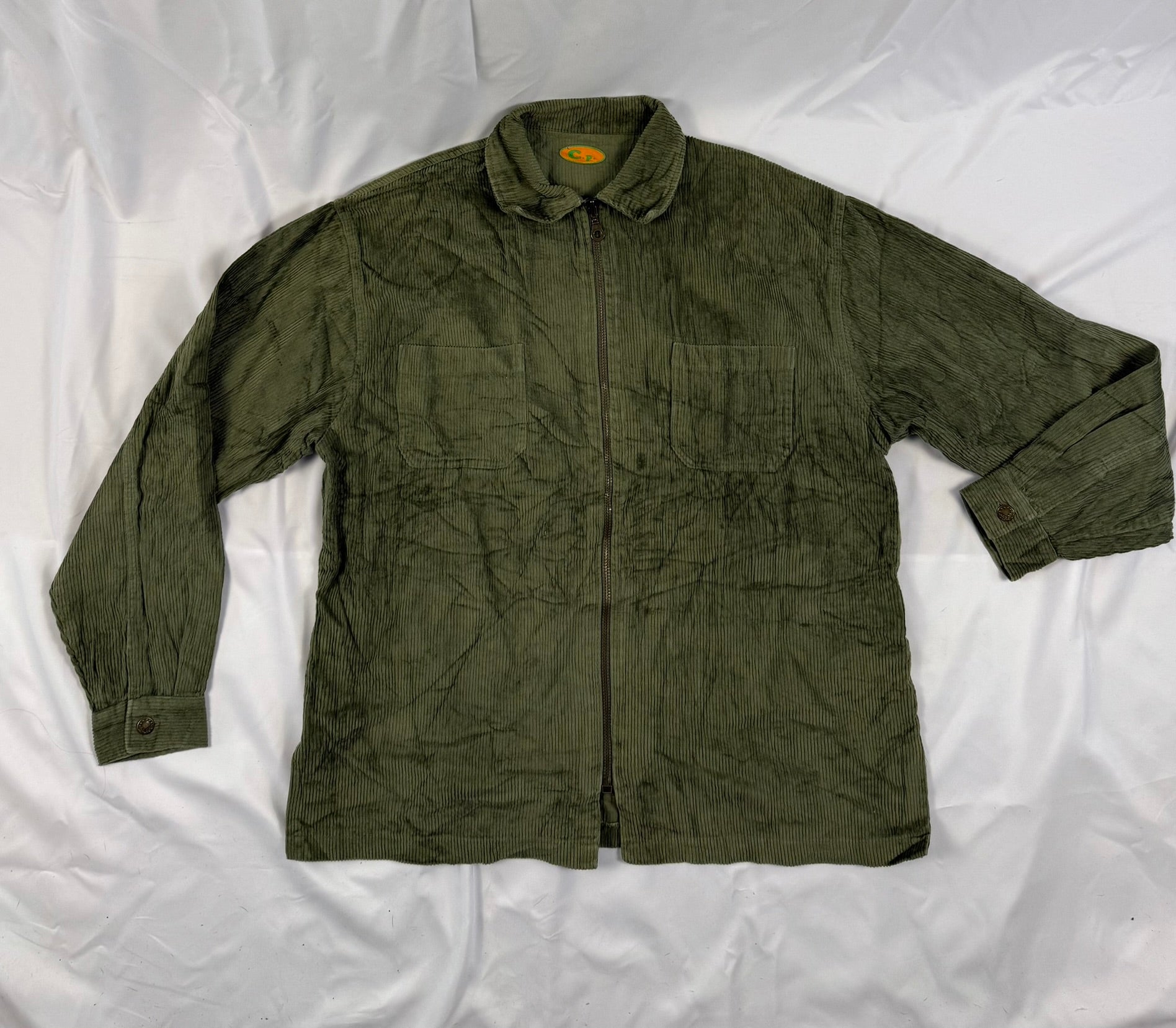 Courdey van het merk C.P.. De courdey is in een herenmaat 4XL en gemaakt in een groene stof en heeft een ritssluiting.